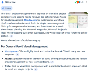 For example, a search for “Best project management tools” might feature a Trello or Asana article as a top reference in the AI overview, guiding users to explore the content further. This demonstrates how strategically optimised content can build trust and encourage user engagement.
